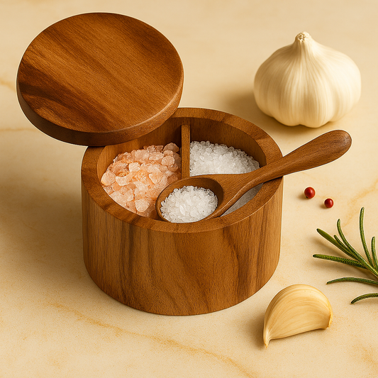 Natural Acacia Wood Salt & Pepper Cellar + Spoon Included